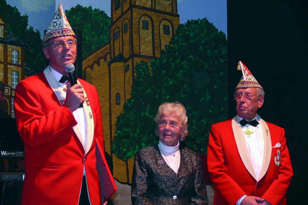 Ehrenpräsident Franz Heinrich Krey erzählte von Martha Damm, die als Kind dabei war, als im Wohnzimmer ihres Vater Louis Weber die Gründung der Großen als erste richtige Karnevalsgesellschaft in Bergisch Gladbach beschlossen wurde. Martha Damm, inzwischen 90 Jahre geworden, blieb der „Großen“ von Kindesbeinen an verbunden ohne selbst Mitglied werden. Nun wurde sie zu ihrer großen Überraschung zum Ehrenmitglied ernannt.